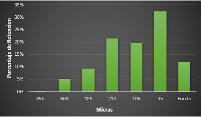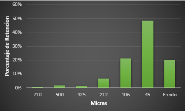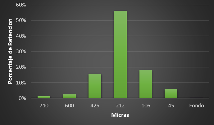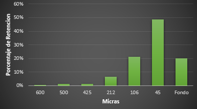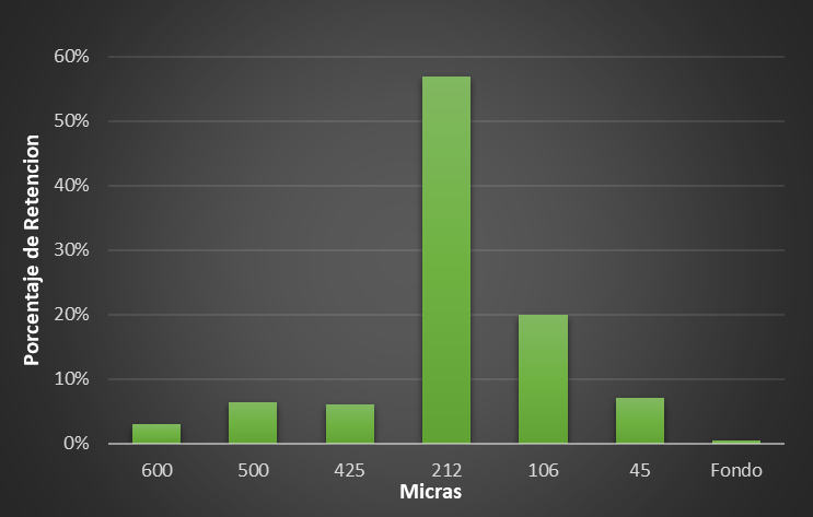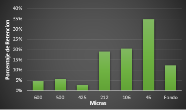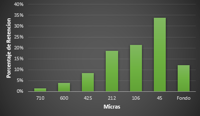 La Figura 2 ilustra la distribución de partículas del ensayo 2. Se evidenció una tendencia similar a la del ensayo 1, donde el tamiz de 212 µm capturó la mayor proporción de partículas, con un 56,2%. En este ensayo, se empleó un intervalo de partículas de 710 a 45 µm, y se observó una reducción de las partículas que atravesaron el fondo, con un 0,3% menos que en el ensayo 1. El TTP de este ensayo, que correspondió al tamaño medio de partículas, se calculó en 316,9 micras, con una desviación estándar del 10,04% respecto al duplicado. Estos resultados evidenciaron una elevada similitud entre los dos ensayos.