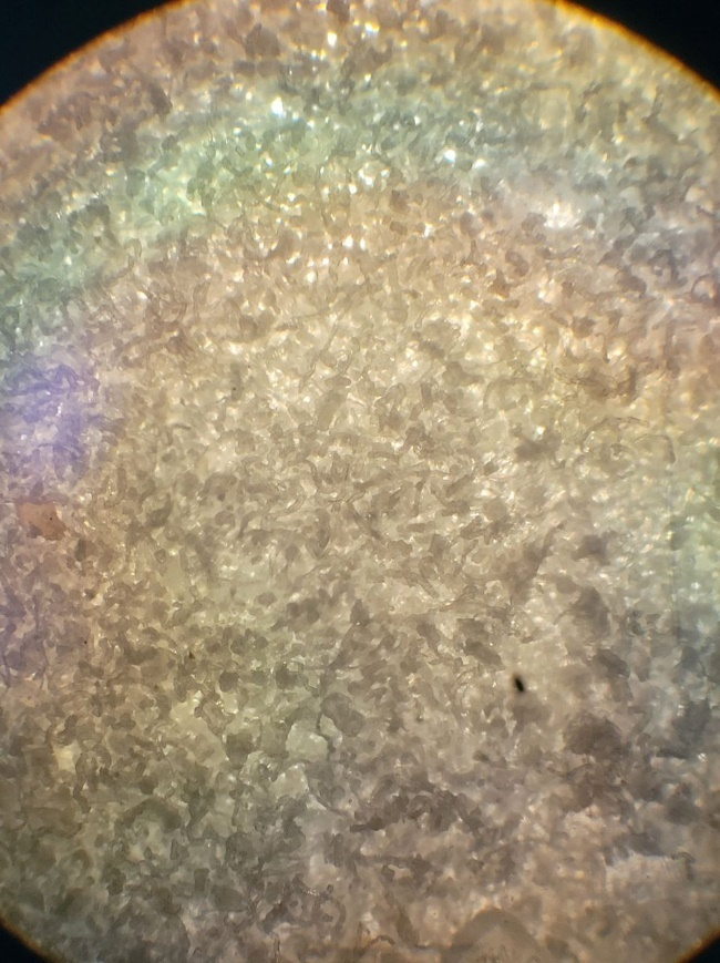 Se demostró que la mezcla de PET 70% y HPMC 30% presentó un tamaño medio de partículas de 200 – 215 µm, lo que es un valor intermedio entre el PET y el HPMC. Además, la mezcla de PET 70% y HPMC 30% tiene un porcentaje de partículas significativamente menor a 45 µm, y debido a la limitación del equipo, no se pudo utilizar tamices de menor tamaño, lo que podría afectar a la precisión del tamaño de partículas. Por los ensayos anteriores, se puede inferir que las partículas que se quedan en el fondo son principalmente de HPMC. Se debe mencionar que también se realizó un análisis de microscopia óptica a cada uno de los materiales planteados. Por consiguiente, se muestran las fotografías para el PET, HPMC y mezcla PET/HPMC, a continuación: