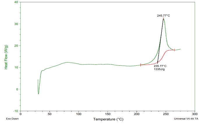 En comparación con los resultados de otros estudios como el de Real y Santana [9], donde la temperatura de fusión del PET blanco fue de 246,98°C, el valor obtenido en este trabajo fue de 245,41°C, lo que muestra una similitud en el comportamiento térmico del material y lo sitúa dentro de ese rango.
