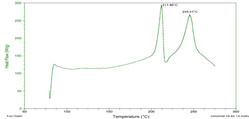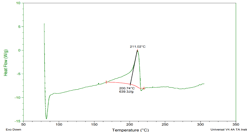 La Figura 19 ilustra el análisis de calorimetría de punto de fusión del HPMC. Se notó que el HPMC comenzó a fundirse a partir de los 200,74 °C, que es el punto donde se inició el aumento del pico de la gráfica, hasta llegar a los 211,02 °C, que correspondieron a su punto de fusión y al punto más alto del pico de la gráfica. Además, el análisis muestra que el punto de fusión del HPMC estuvo 13,98 °C por debajo del punto de fusión teórico mínimo del HPMC, lo que indicó que el material no se está comportando de forma adecuada. Esto puede deberse a varios factores, como la integridad del material, si fue afectado en la fábrica, por lo que podría presentar alteraciones en su comportamiento normal que pueden afectar el punto de fusión.